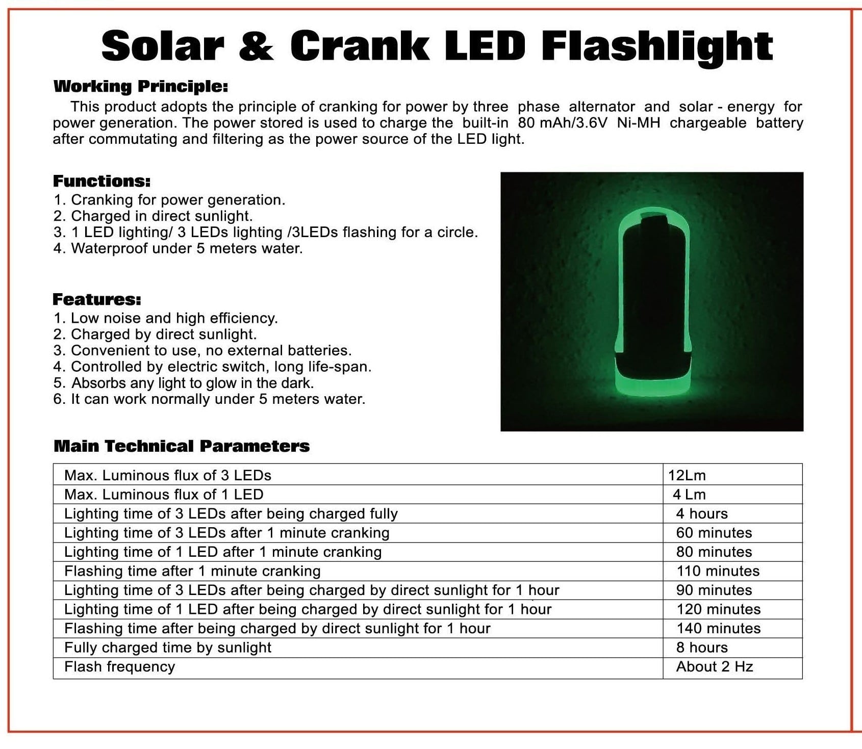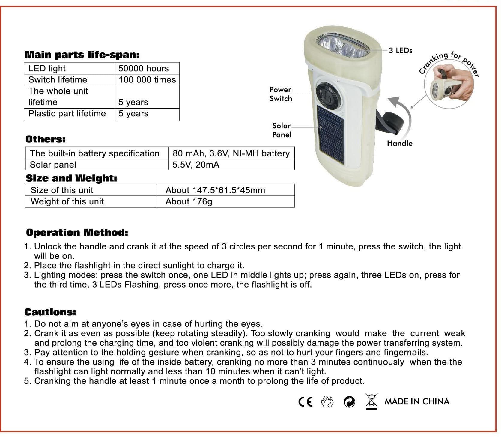 - One minute of cranking gives an hour of bright light. Leave it in the sun to always be charged.